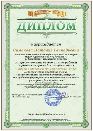 Кроме этого, с данным проектом, Симонова Н.Г. была отмечена Дипломом за представление своего опыта работы в рамках Всероссийского фестиваля "Радуга педагогических проектов - 2014".