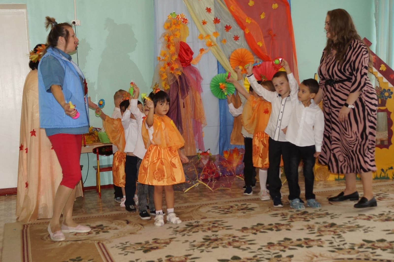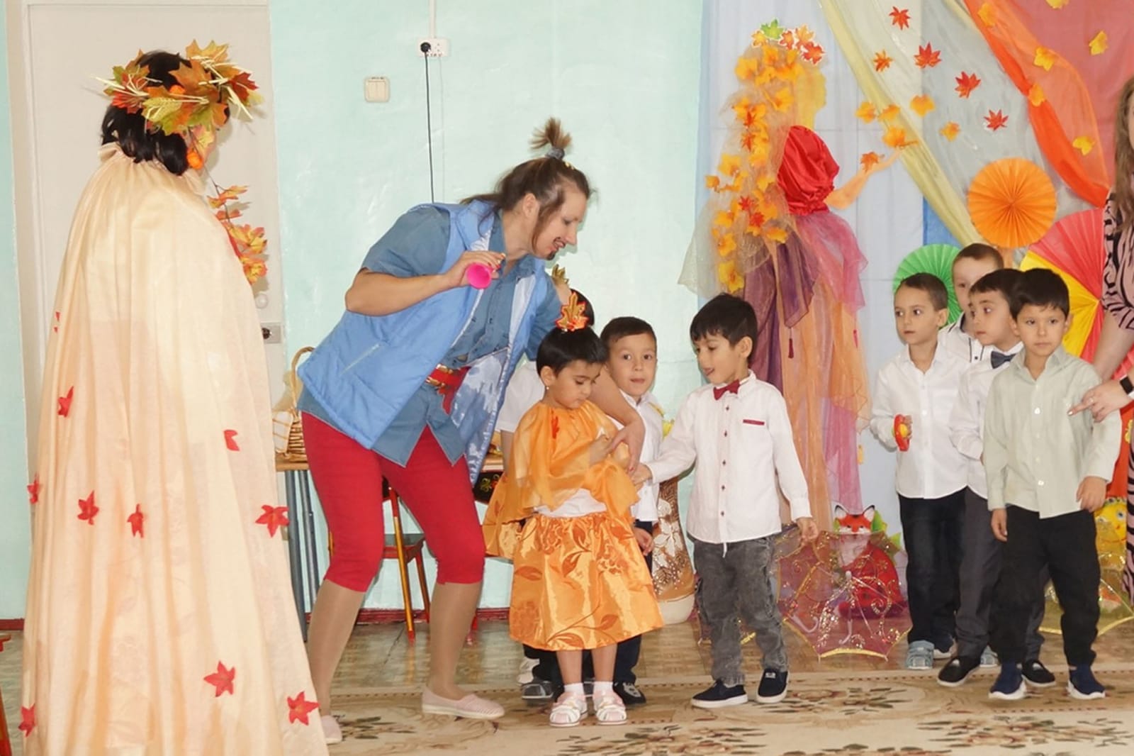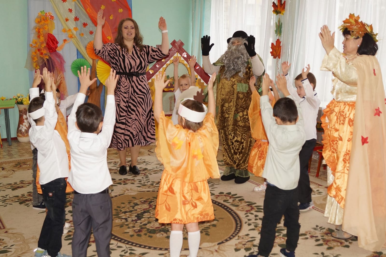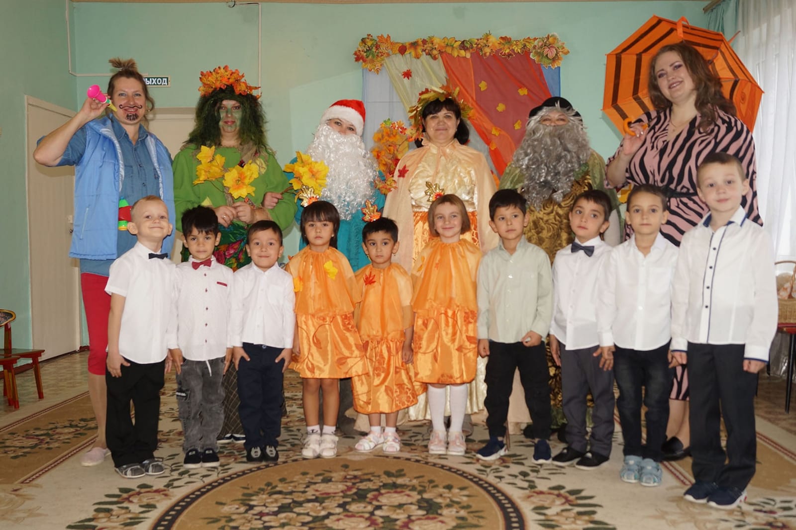 Детям старшей группы Осень предложила собрать по лесу волшебные листочки, чтобы открыть сундучок с осенними подарками. В лесу ребята встретили сказочных лесных персонажей: Гномика, Соловья-разбойника, Кикимору, Старичка-лесовичка. Лесные герои попросили выполнить осенние задания и только потом отдали листочки ребятам. Осень открыла свой сундучок и угостила всех сочными наливными яблоками.