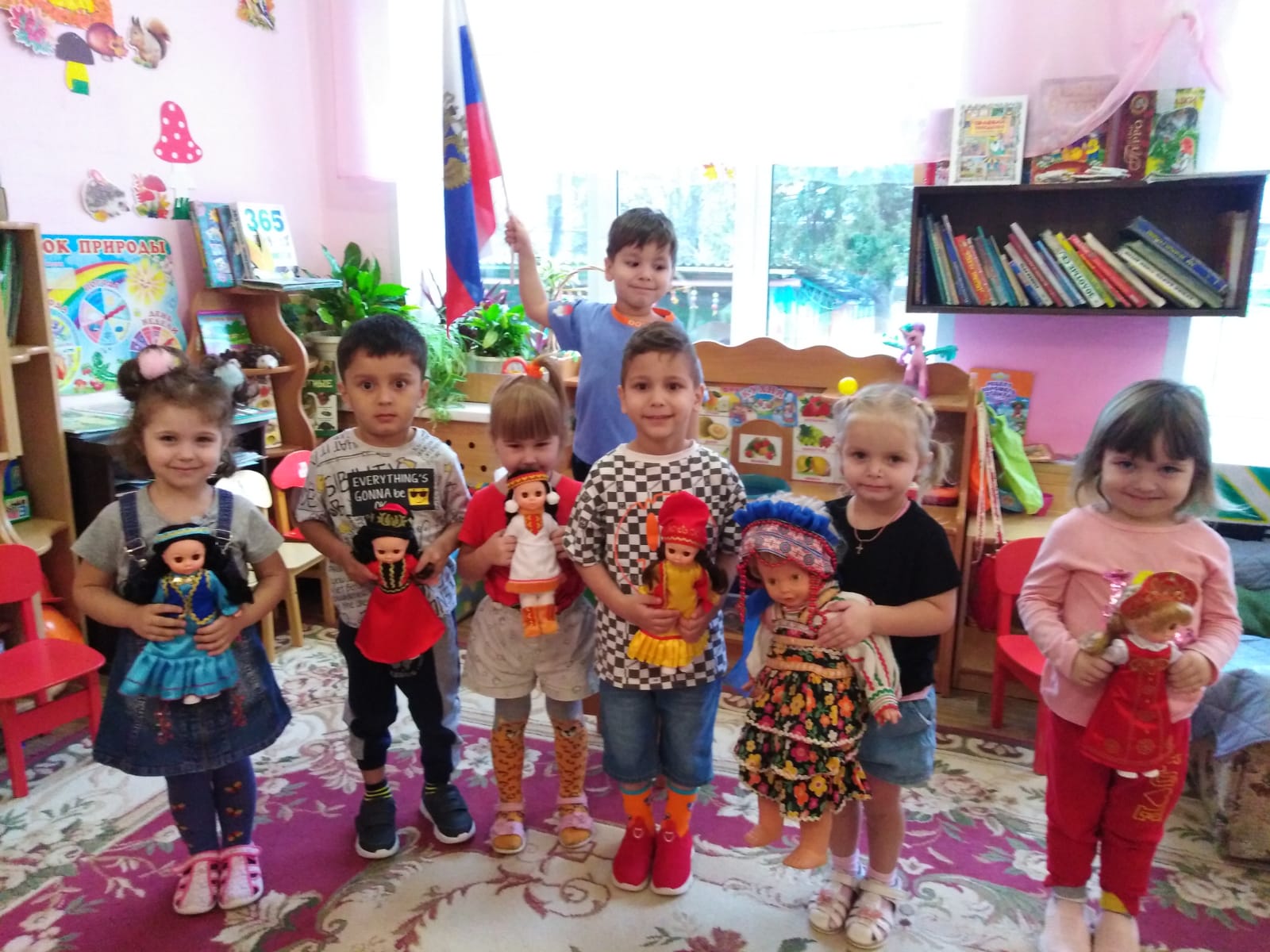 4 ноября наша страна отмечает День народного единства. Очень важно передать будущим поколениям тот дух единства, которым сильна Россия. Детки младшей группы рассмотрели кукол в национальных костюмах, поиграли в народные игры, познакомились с символами России.
