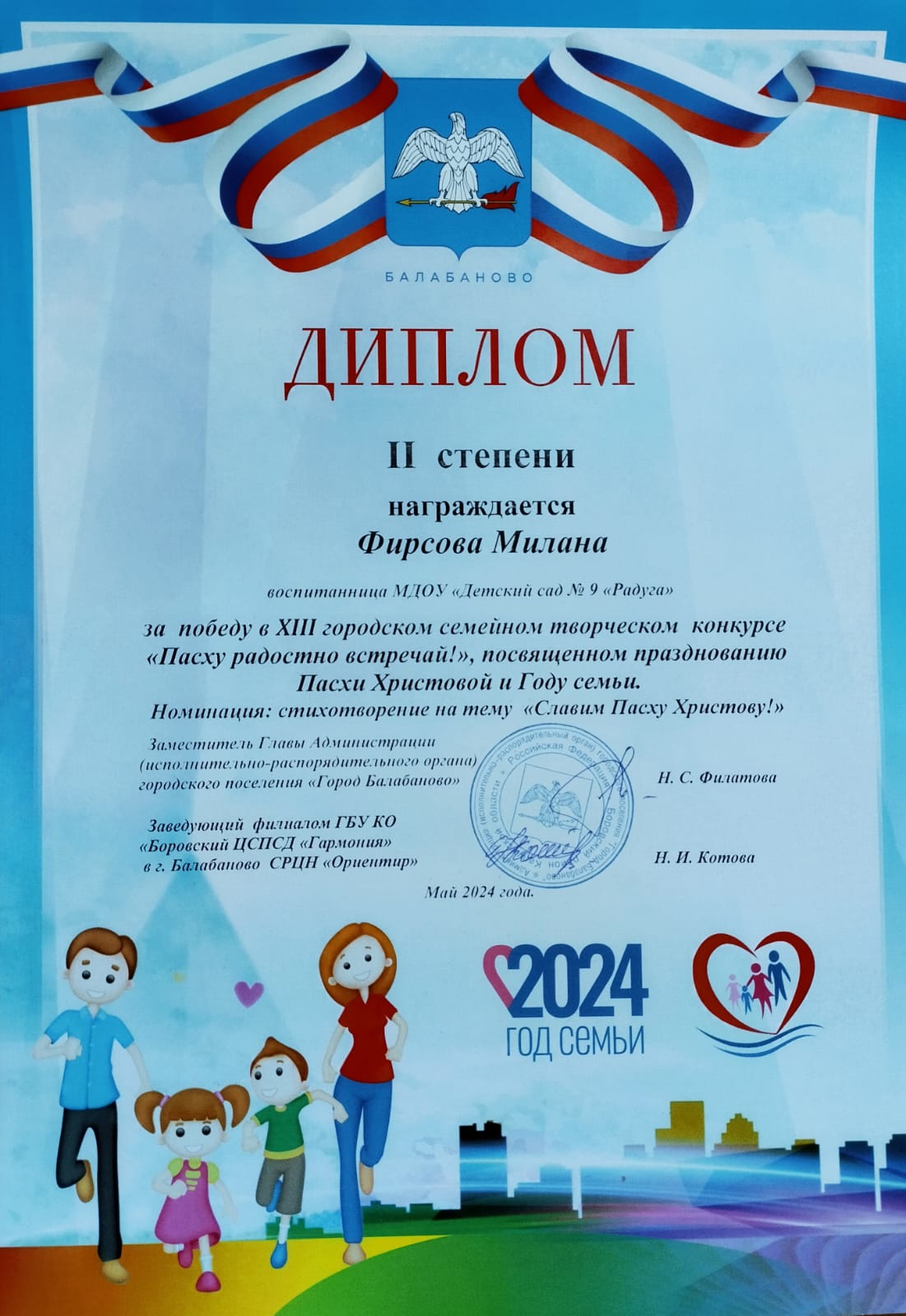 Воспитанница старшей группы Фирсова Милана приняла участие в XIII городском семейном творческом конкурсе "Пасху радостно встречай!" и заняла II почетное место. Поздравляем Милану и ее маму Светлану Вячеславовну с победой и желаем им ярких побед и творческих успехов.